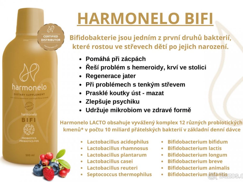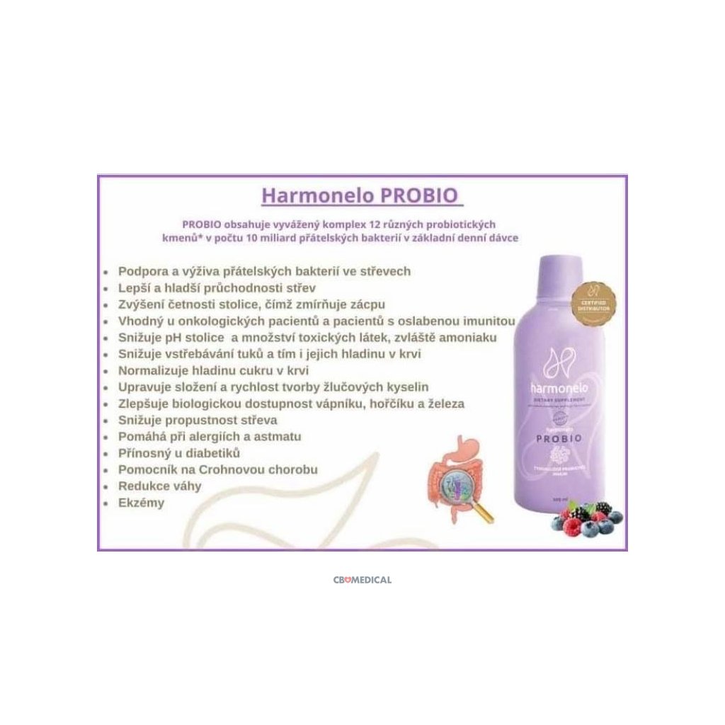 Doplnok stravy Harmonelo Probio je sirup na báze prebiotickej rozpustnej vlákniny z čakanky. Obsahuje jedinečnú kombináciu 12 probiotických kmeňov šetrne ošetrených tzv. Tyndalizační technológiou, vďaka ktorej si probiotiká zachovávajú svoj účinok. Odporúčaná dávka obsahuje probiotikum vyrobené z 10 miliárd baktérií. Produkt je posilnený čistým inulínom, čím sa vytvára silný synergický efekt na priateľské črevné baktérie.