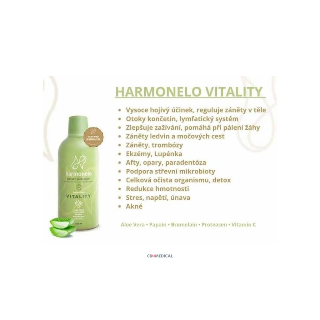 Doplnok stravy Harmonelo Vitality je sirup na báze prebiotickej rozpustnej vlákniny z čakanky. Obsahuje jedinečnú kombináciu aktívnych enzýmov papaínu, bromelainu a proteázy. Aloe vera pôsobí ako účinný antioxidant prispieva k očiste organizmu. Základom sirupu je 85% rozpustná čakanková vláknina na báze fruktooligosacharidov, ktorá podporuje množenie priateľských črevných baktérií.