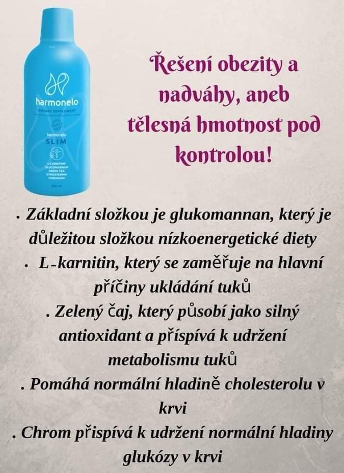Charakteristika: Harmonelo SLIM je sirup na báze prebiotickej rozpustnej vlákniny a komplexu biologicky aktívnych molekúl určených na redukciu telesnej hmotnosti. Základnou zložkou je glukomanán, ktorý je dôležitou zložkou nízkoenergetickej diéty. Dôležitou zložkou je L-karnitín, ktorý sa zameriava na hlavné príčiny ukladania tukov. Extrakt z opuncie sa vyznačuje schopnosťou viazať tuky a obmedzovať ich vstrebávanie. Harmonelo SLIM obsahuje extrakt zo zeleného čaju, ktorý pôsobí ako silný antioxidant a prispieva k udržaniu metabolizmu tukov. Mikrobiálne aktivovaná Gynostema päťlistá označovaná tiež ako ženský pilistový obsahuje vysokú koncentráciu biologicky dostupných ginsenoidov. Jeho účinok je posilnený extraktom z chmeľu s obsahom xantohumolu. Monakolin K z červenej fermentovanej rýže prispieva k udržaniu normálnej hladiny cholesterolu v krvi. Chróm prispieva k udržaniu normálnej hladiny glukózy v krvi.