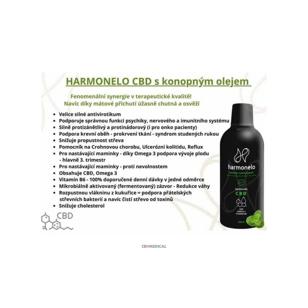 Doplnok stravy Harmonelo CBD je sirup na báze prebiotickej rozpustnej vlákniny a komplexu biologicky aktívnych molekúl. Hlavnou zložkou je čistý konopný olej s prírodným obsahom CBD. Ďalšou zložkou sú Omega 3 esenciálne mastné kyseliny (EFA), ktoré pochádza z rybieho tuku. Mastné kyseliny sú nevyhnutné pre celkové zdravie a pohodu. Sú dôležité pre ľudské telo, pretože sú súčasťou každej živej bunky v tele. Základom sirupu je koncentrovaná rozpustná vláknina z kukurice, ktorá sa veľmi dobre stráviteľná črevné mikrobiotou a pôsobí teda silne prebioticky - podporuje priateľské črevné baktérie. Nemá nežiaduce nafukovacie účinky. Ďalej obsahuje vitamín B6, ktorý podporuje správnu funkciu imunitného systému a prispieva k normálnej činnosti nervovej sústavy, ktorá ovláda činnosť všetkých orgánov v tele pre zdravý životný štýl, vrátane psychickej pohody. Mikrobiálne aktivovaný (fermentovaný) zázvor sa vďaka úprave bakteriálnych enzýmov vyznačuje radom jedinečných vlastností.